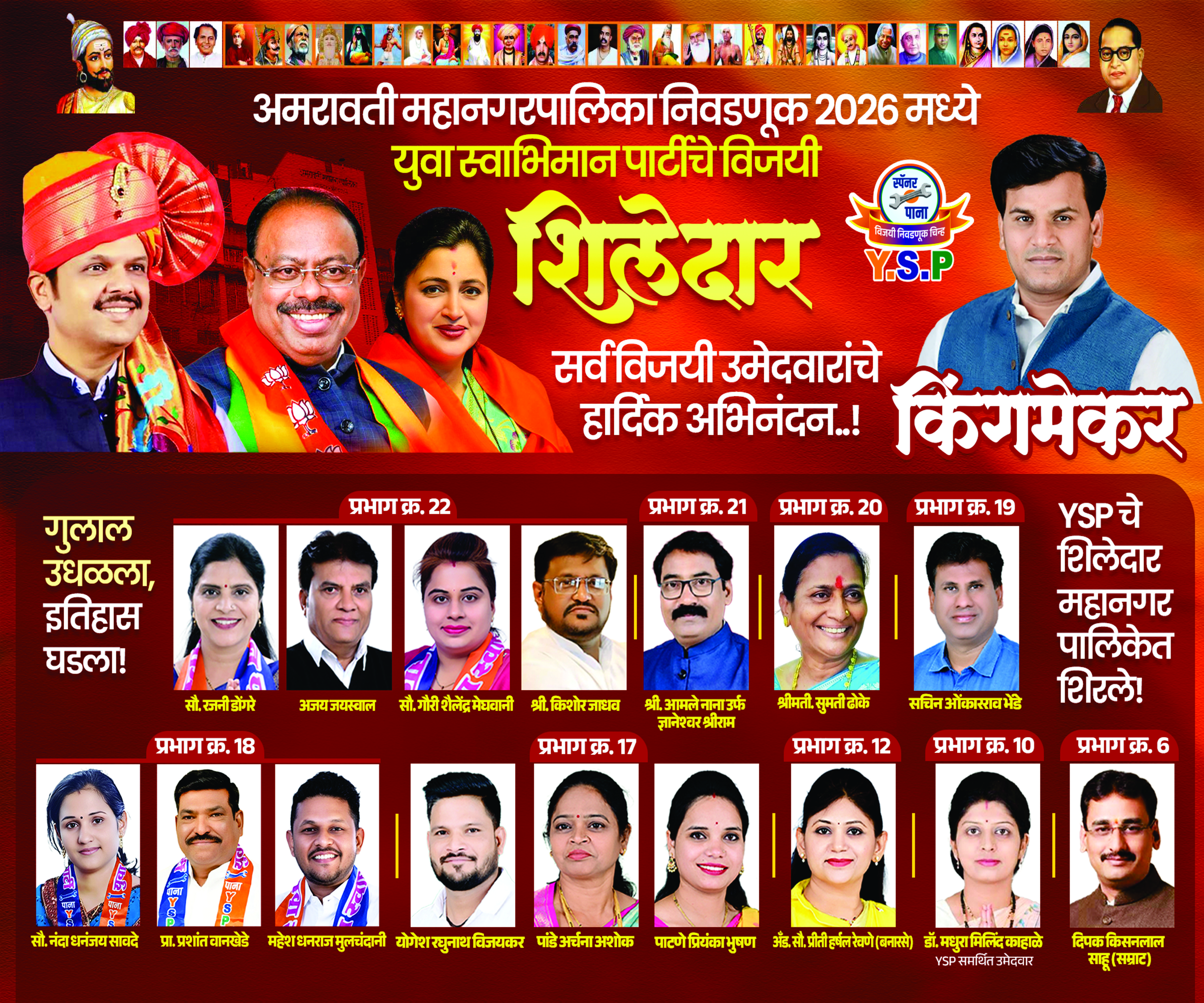 Under the leadership of Shri Ravi Rana, the Yuva Swabhiman Party achieved a historic and resounding victory in the Amravati Municipal Corporation Elections 2026, securing 15 seats and reflecting the immense trust and confidence reposed by the people of Amravati. This decisive mandate was widely viewed as a strong endorsement of people-centric governance, transparent leadership, and a clear vision for the city’s overall development. The remarkable success was made possible through the tireless efforts of grassroots workers, committed leaders, and the unwavering support of citizens who voted for progress and stability. Senior leaders and well-wishers extended their congratulations to the victorious candidates, stating that this mandate would significantly strengthen effective administration and fast-track developmental initiatives across Amravati. This landmark achievement marks a decisive step toward building a progressive, inclusive, and well-governed municipal corporation.